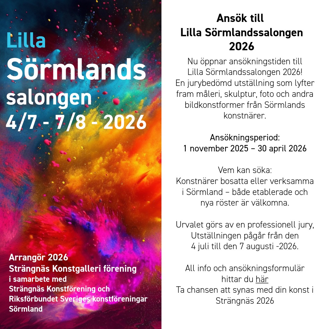 Lilla Sörmlandssalongen, den andra i ordningen, visas nästa gång på Strängnäs konstgalleri 4 juli - 7 augusti 2026. Ansökan att medverka är öppen t.o.m. 30 april 2026. Salongen är öppen för bildkonst och skulptur.